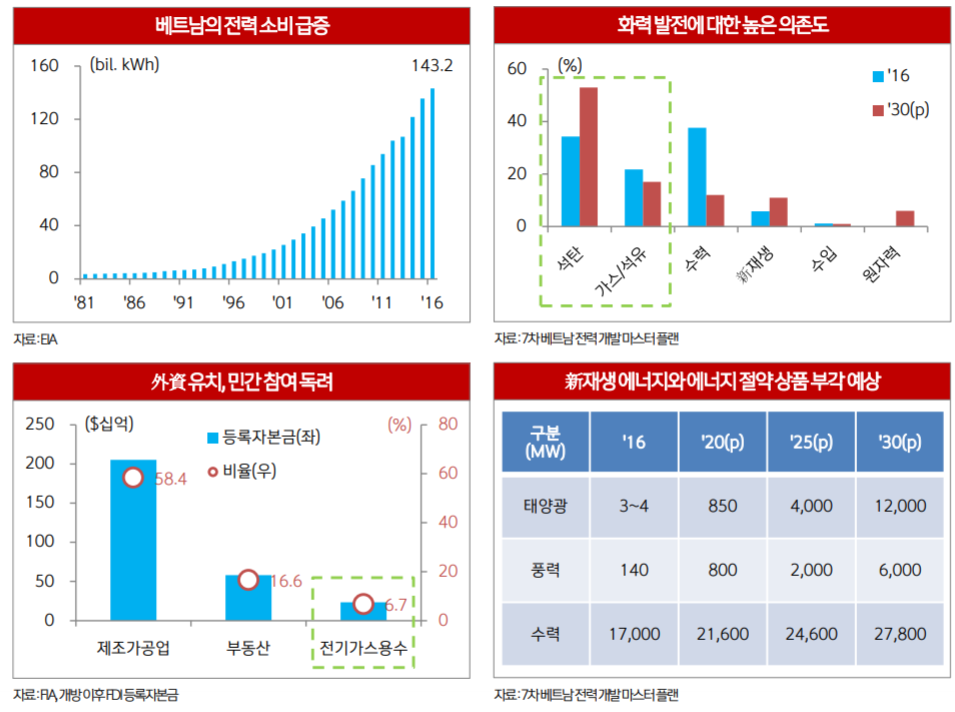 베트남 경제는 작년 7%, 올해 상반기 6.8% 성장하며, 신흥 아시아에서 가장 가파른 성장세를 기록하고 있으나, 이를 뒷받침할 필수 인프라 중 하나인 전력이 부족한 상황에 직면. 여기에 더해 일부 발전소 프로젝트가 지연되면서 최근 임시방편으로 인근 중국과 라오스에서 전력을 수입하는 실정. 原電프로젝트 추진 철회 이후 당분간 화력 및 수력발전에 대한 높은 의존도가 유지되는 가운데 新재생에너지에 대한 관심과 지원이 이어질 것으로 예상