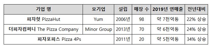 세계적인 외식기업 Yum의 체인인 피자헛(PizzaHut), 태국 마이너그룹(Minor Group)의 더피자컴퍼니(The Pizza Company), 베트남 현지에서 일본인이 운영하는 피자포피스(Pizza 4Ps) 등임.