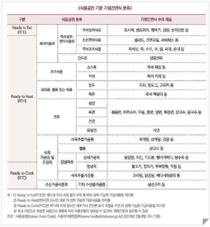 식품공전(Korean Food Code)에서는 가정간편식의 범위를 즉석섭취·편의식품류로 보고 있다