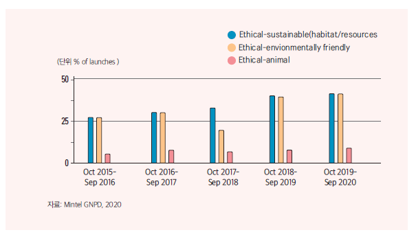 → 유럽에서 출시된 어류 제품에서 윤리적 광고를 실시하고 있는지를 살펴본 Mintel의 조사에서는 2019년 10월 ~ 2020년 9월까지 출시된 제품 중 지속가능성 광고를 실시하고 있는 제품은 42%, 친환경 광고를 실시하고 있는 제품 역시 42%, 동물 보호 관련 광고를 하고 있는 제품은 10%로 나타났으며, 지속적으로 증가하는 추세를 보이고 있다