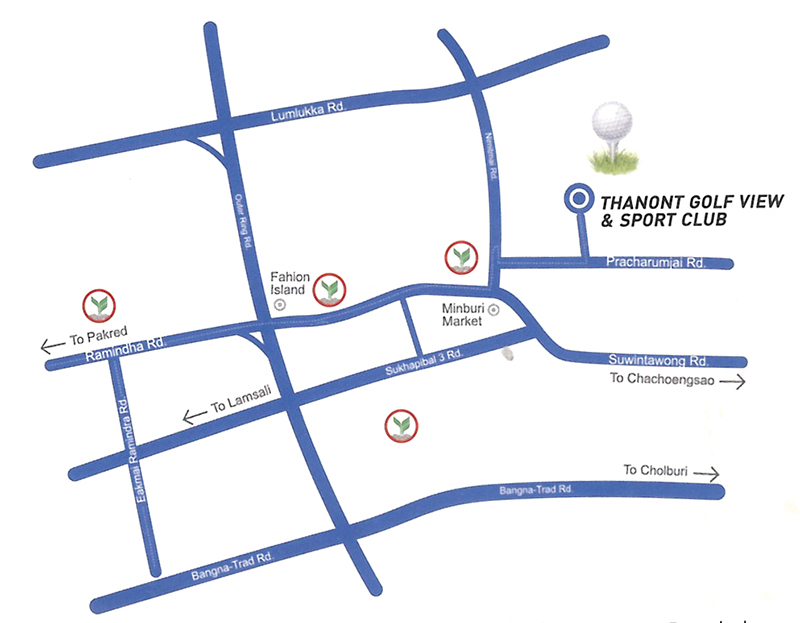 에까마이-람인트라 고속도로를 따라가다 람인트라로 빠지는 교차로를 이용해 패션 아이랜드 쇼핑몰로 나가면 니밋마이 로드를 만나게 되고 첫번째 유턴지점에서 유턴하여 프라차루엄짜이 로드로 진행하면 왼쪽으로 골프장이 나타난다.