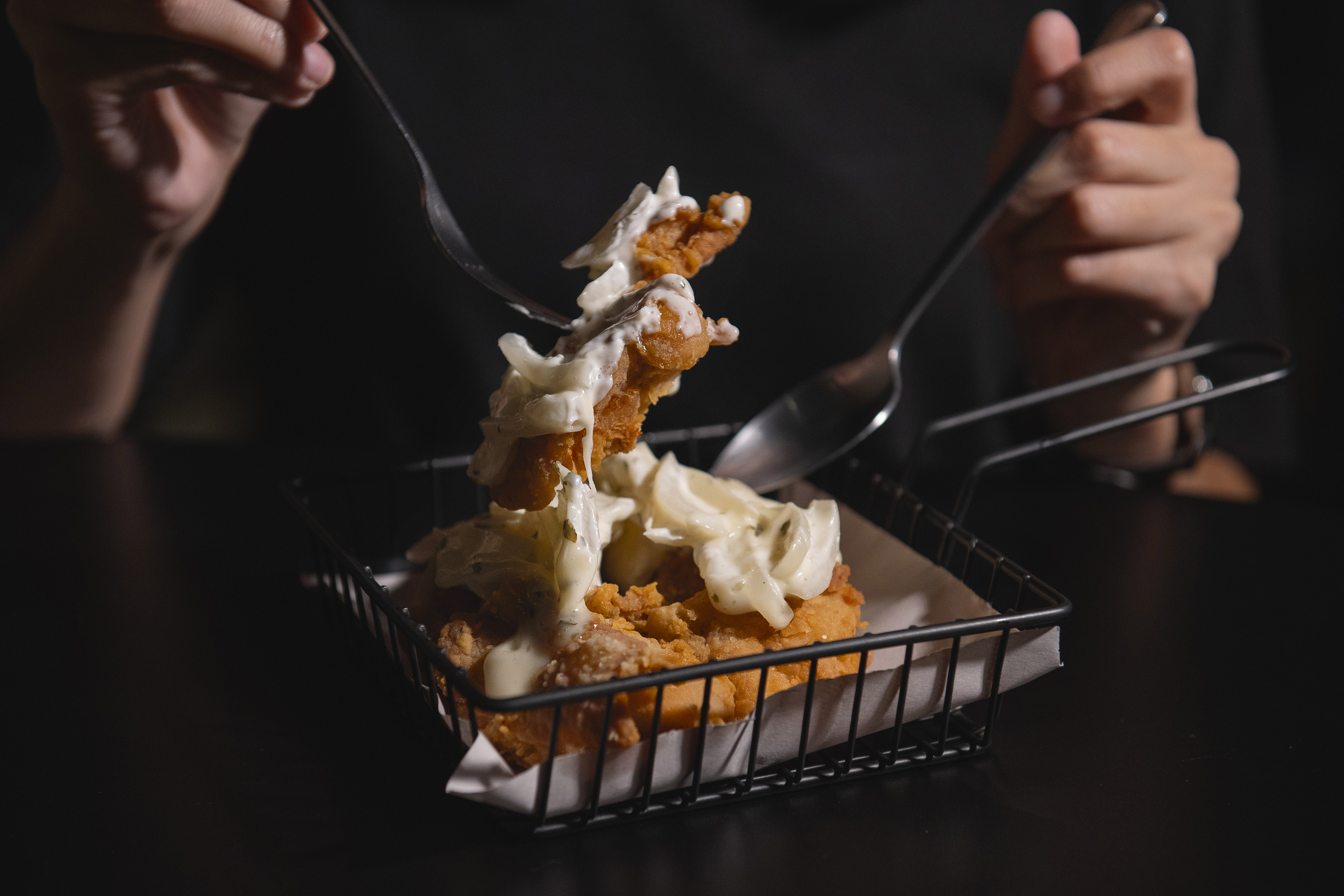 바깥은 바삭하고 속은 부드러운 버블 프라이드 치킨은 집에서 만든 양파 사워 크림 소스로 맛을 낸다.