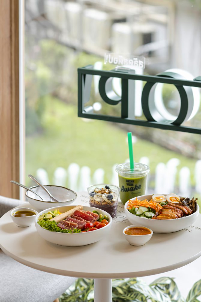 음식 면에서는 다양한 샐러드, 스무디, 아사이 볼 등 건강한 메뉴가 가득합니다. Yellow Mellow, Get Shrek'd, Berry Grape-ful과 같은 스무디부터 Tuna San, Hail Caesar, Bibim Go, Gin Jai에 이르기까지, 모든 메뉴는 신선하고 건강한 재료로 만들어져 건강한 식사를 즐길 수 있습니다. 특히, Choco Banana Yogurt과 같은 건강한 디저트까지 제공되어, 맛있고 건강한 식사를 완벽하게 마무리할 수 있습니다.