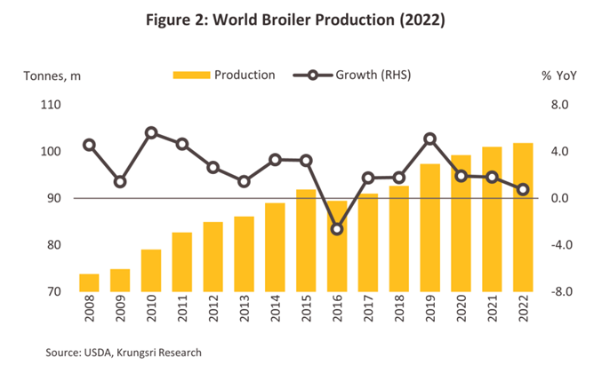 태국은 전 세계 닭고기 생산량의 3.2%, 소비량의 2.5%를 차지하며, 생산에서는 7위, 소비에서는 9위에 해당하는 주요 국가로 자리잡고 있습니다.