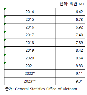 2023년 베트남의 총 수산물 생산량은 약 931만 톤으로 전년 대비 소폭 증가했다.