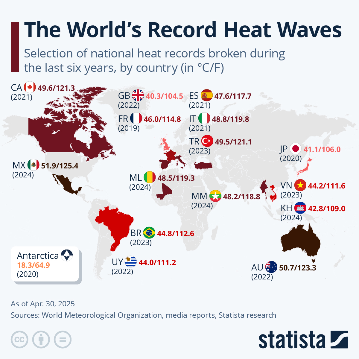 최근 6년간(2019~2025년) 깜짝 온도 기록을 세운 나라들을 정리했습니다. 멕시코(51.9℃), 호주(50.7℃), 터키(49.5℃) 등 예상 밖의 고온 현상이 전 세계를 강타했는데요.