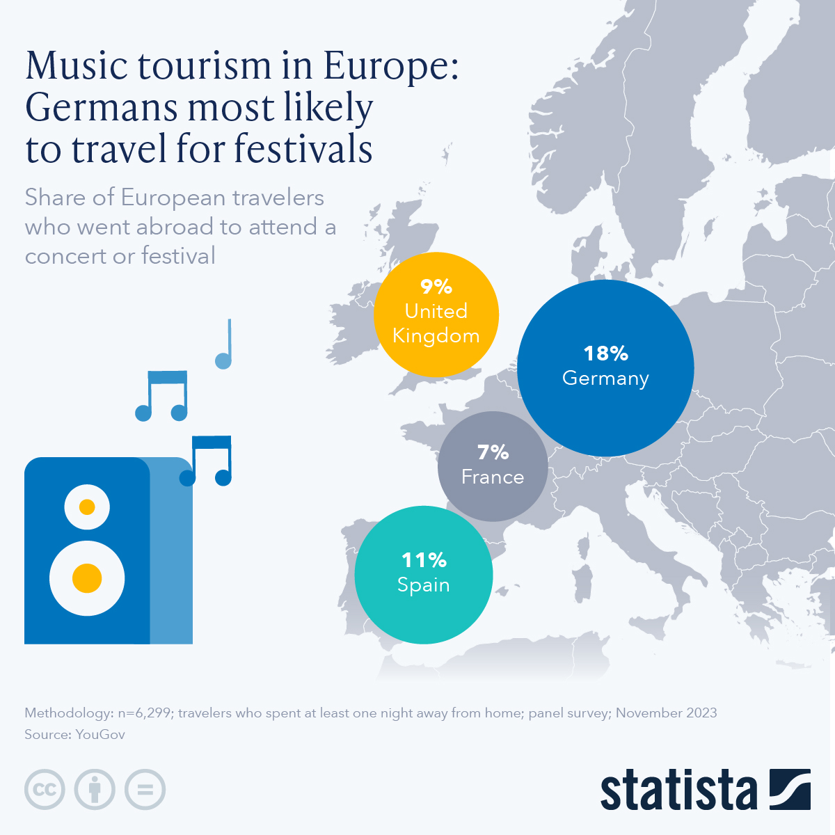 유럽 여행자 6,299명을 대상으로 조사한 결과, 해외 콘서트·페스티벌을 보러 떠나는 비율 1위는 독일(18%)이었습니다. 이어 스페인(11%), 영국(9%), 프랑스(7%) 순! 음악관광 메카로 떠오른 이들 국가의 인기 페스티벌과 여행 팁을 알아봅니다.