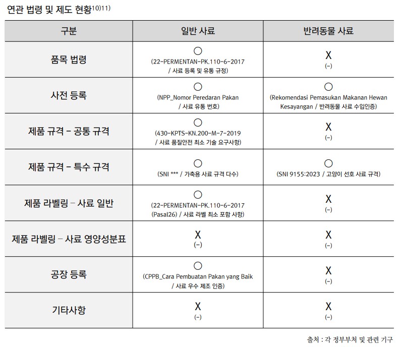 - 일반 가축사료 최소요건(수분·조회분·조단백 등) 체계가 존재하나, 반려동물 전용 별도 규격은 제한적. 다만 SNI 9155:2023(고양이 선호 사료) 등 기준이 가동 중.