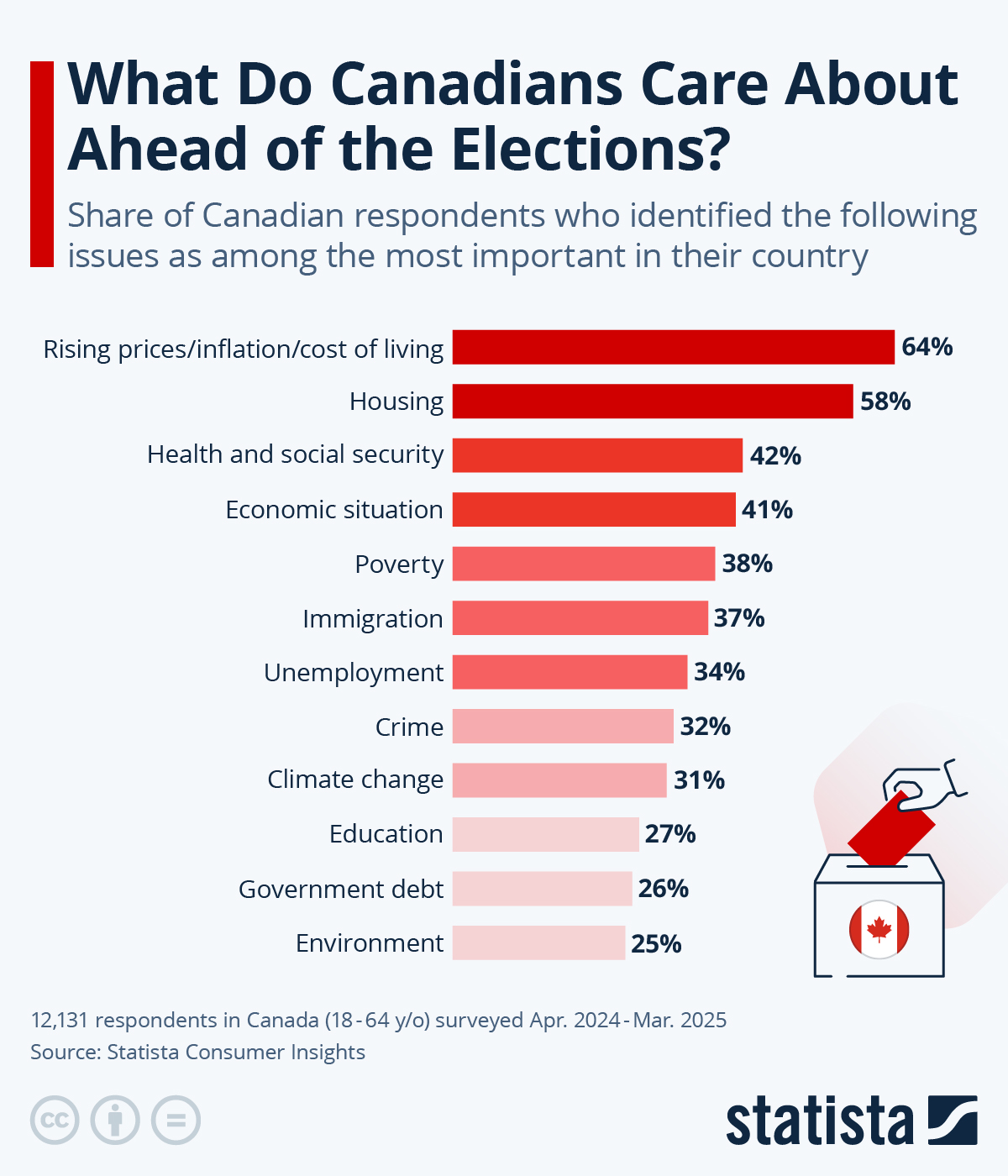 2024년 4월~2025년 3월 캐나다 성인 12,131명 설문 결과, ‘물가·생활비 상승(64%)’과 ‘주택 문제(58%)’, ‘보건·사회안전망(42%)’이 내년 총선 유권자들이 가장 중요하게 꼽은 이슈로 조사됐습니다.