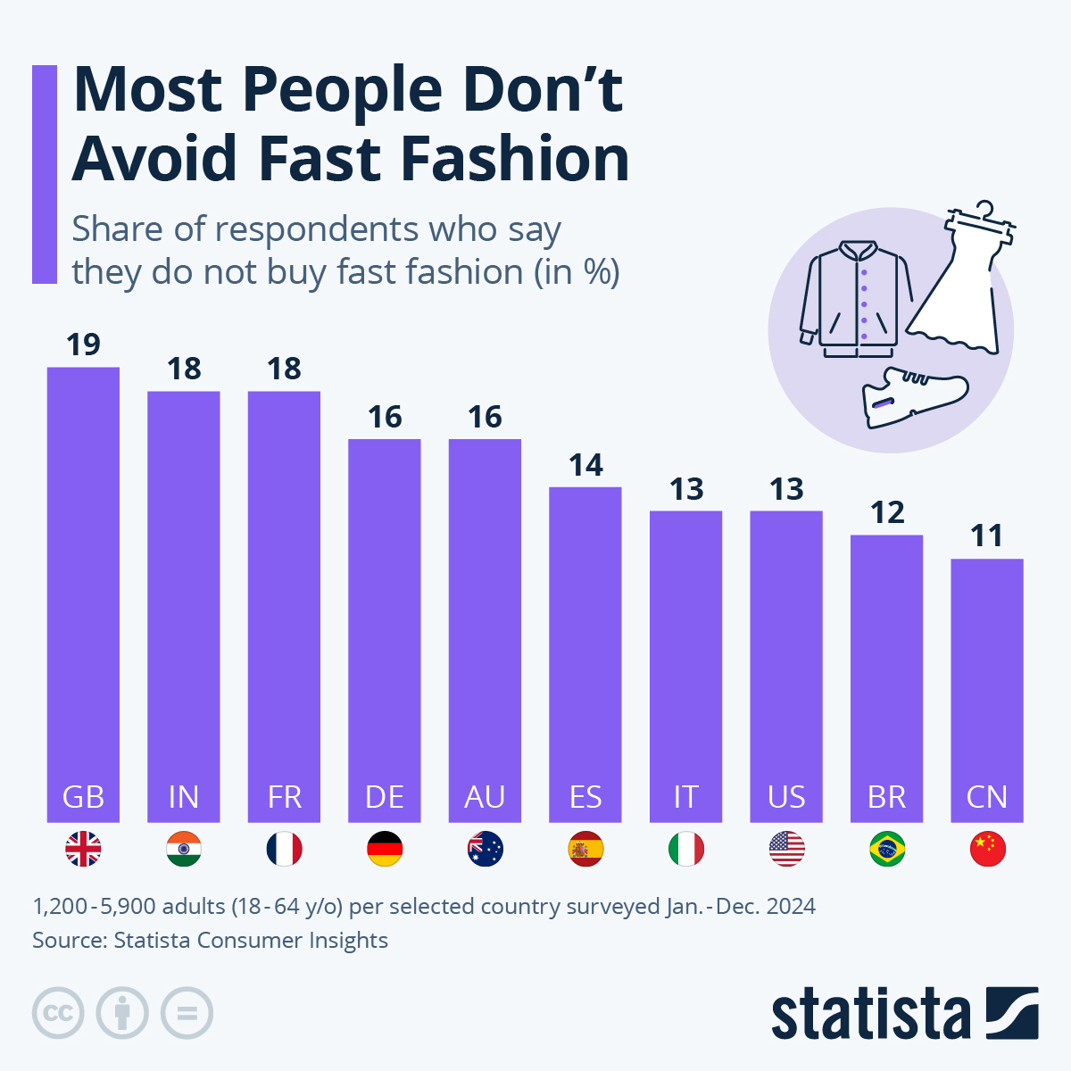 영국(19%)·인도·프랑스(각 18%) 등이 패스트패션 회피율 상위권을 차지한 반면 중국은 11%에 그쳤습니다. 10개국 설문을 통해 본 지속가능 소비 현황과 실천 과제를 정리했습니다
