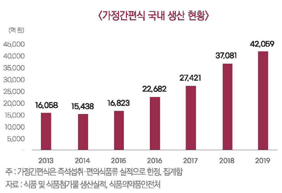 2019년 4조 2,059억 원으로 최근 5년 간 150.0% 성장하였다. 가정간편식의 규모는 향후 지속적으로 성장할 것으로