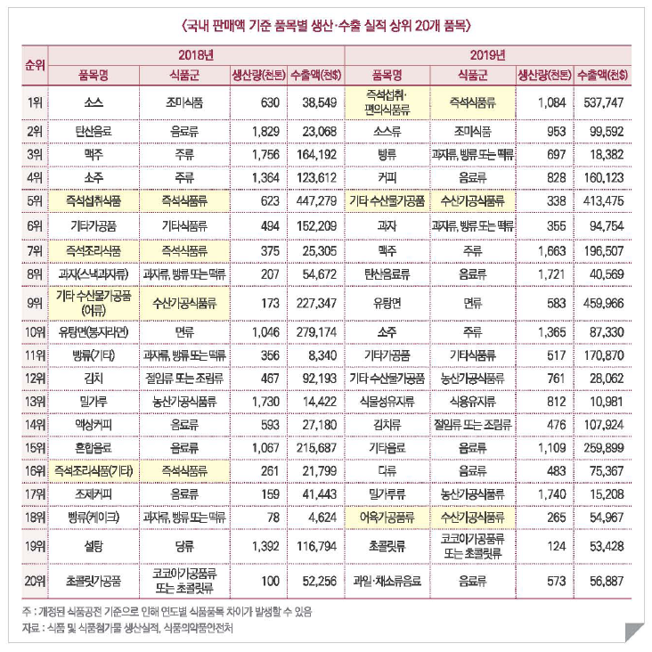 국내 판매액 기준 상위 20개 품목에 대한 생산·수출 실적을 살펴보면 2018년 즉석식품류(즉석섭취식품, 즉석조리식품, 즉석조리식품(기타))는 각각 5위, 7위, 16위로 소스, 탄산음료, 맥주, 소주와 같은 조미식품과 음료류에 비해 상대적으로 뒤처진 판매액을 보였다. 하지만 2019년에 들어서는 국내 판매액 1위에 해당하는 높은 판매액을 기록하였다. 아울러 수산가공품도 2018년 9위(기타 수산물가공품(어류))에 해당하는 판매액을 기록하였으나 2019년에 들어서는 5위로 높은 순위권을 보이는 등 수산가공식품류의 판매도 꾸준히 성장하였다.