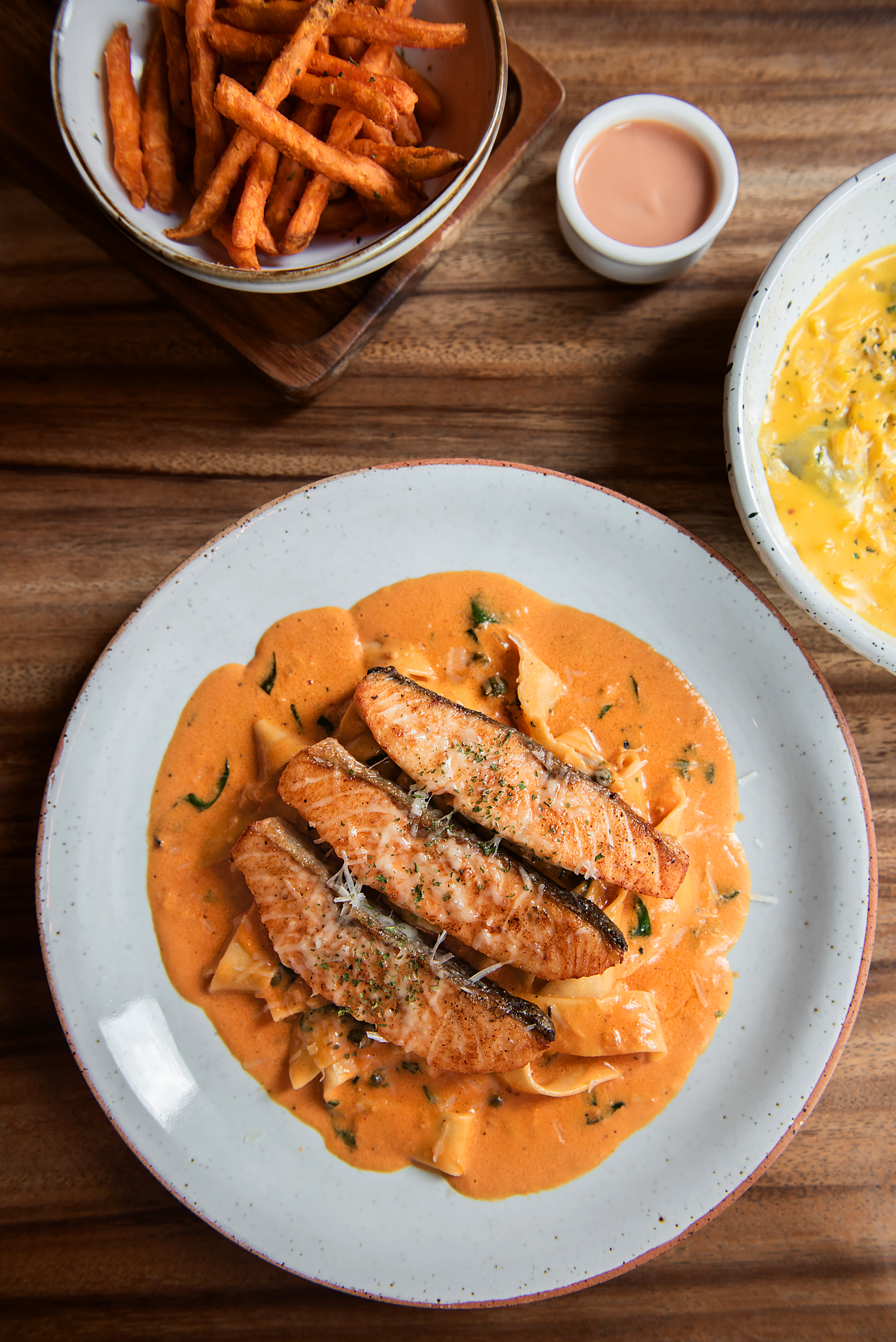 음식: 모든 피자는 주문 즉시 신선하게 구워져 나오며, 손수 만든 신선한 면을 사용하는 파스타는 부드럽고 쫄깃한 식감을 자랑합니다. 특히, Salmon Pink Sauce Pasta와 Sausage Ravioli Creamed Corn은 맛과 질감 모두에서 뛰어납니다. 스테이크는 수비드 방식으로 완벽한 육즙과 풍미를 자랑하며, Pepper Pork Steak은 24시간 이상 끓인 흑후추 그레이비 소스와 함께 제공됩니다. 피자 섹션도 주목할 만한데, Burrata & Black Forest Ham Pizza와 Truffle Pizza는 네오폴리탄 스타일의 도우와 잘 어울립니다.