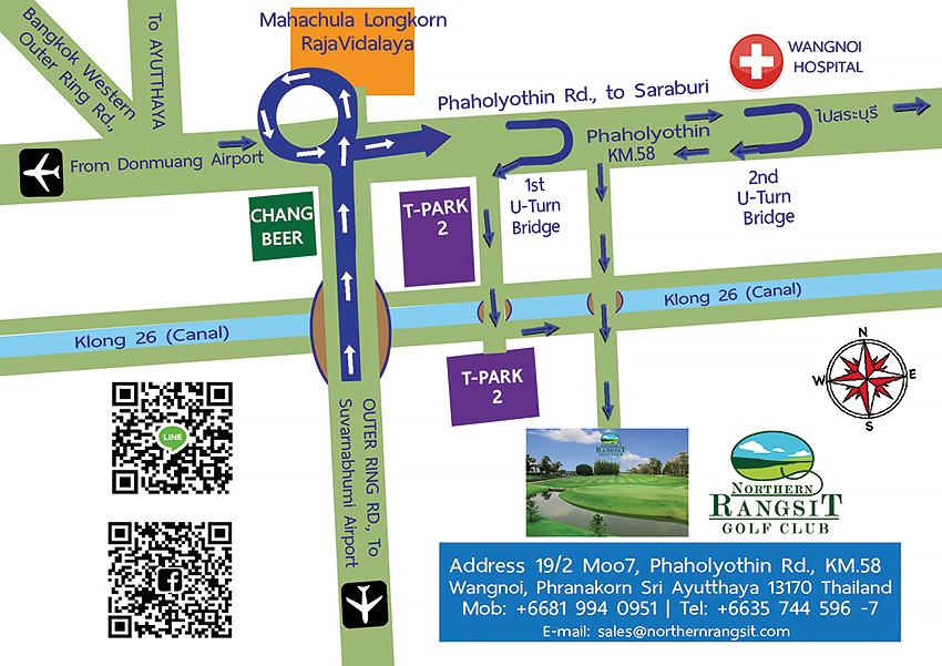 돈무앙 공항에서 1번 고속도로를 타고 사라부리 쪽으로 계속 직진하면 약 30분후 골프장 표시가 나타난다. 무엉 액 골프장 건너편 쯤으로 생각하면 쉽다.