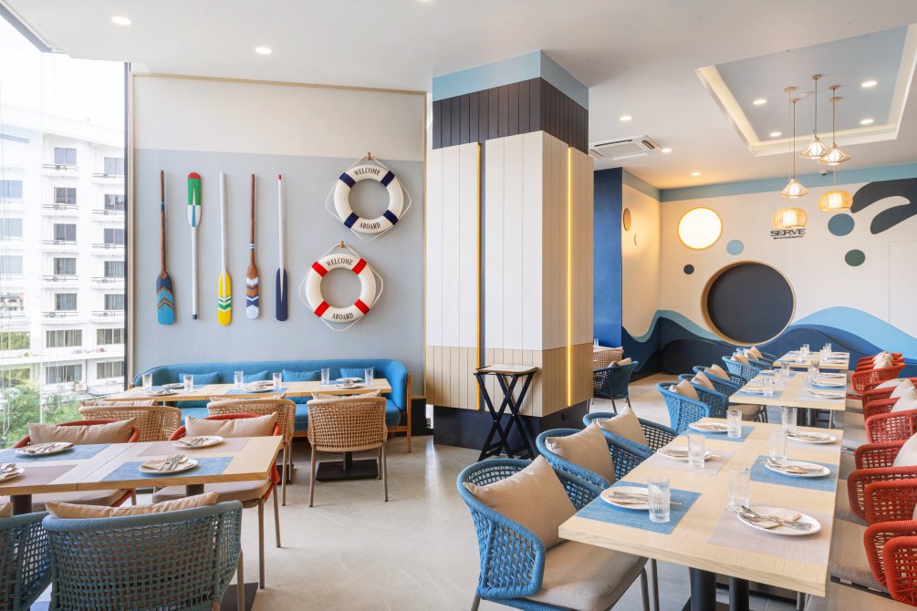 "Sea to Serve"의 인테리어는 마치 바닷가에 온 듯한 느낌을 줍니다. 푸른 바다를 연상시키는 파란색과 하얀색의 인테리어는 이곳만의 특별한 분위기를 자아내며, 방문하는 이들로 하여금 일상의 분주함에서 잠시 벗어나 바다의 평온함을 느끼게 해줍니다.