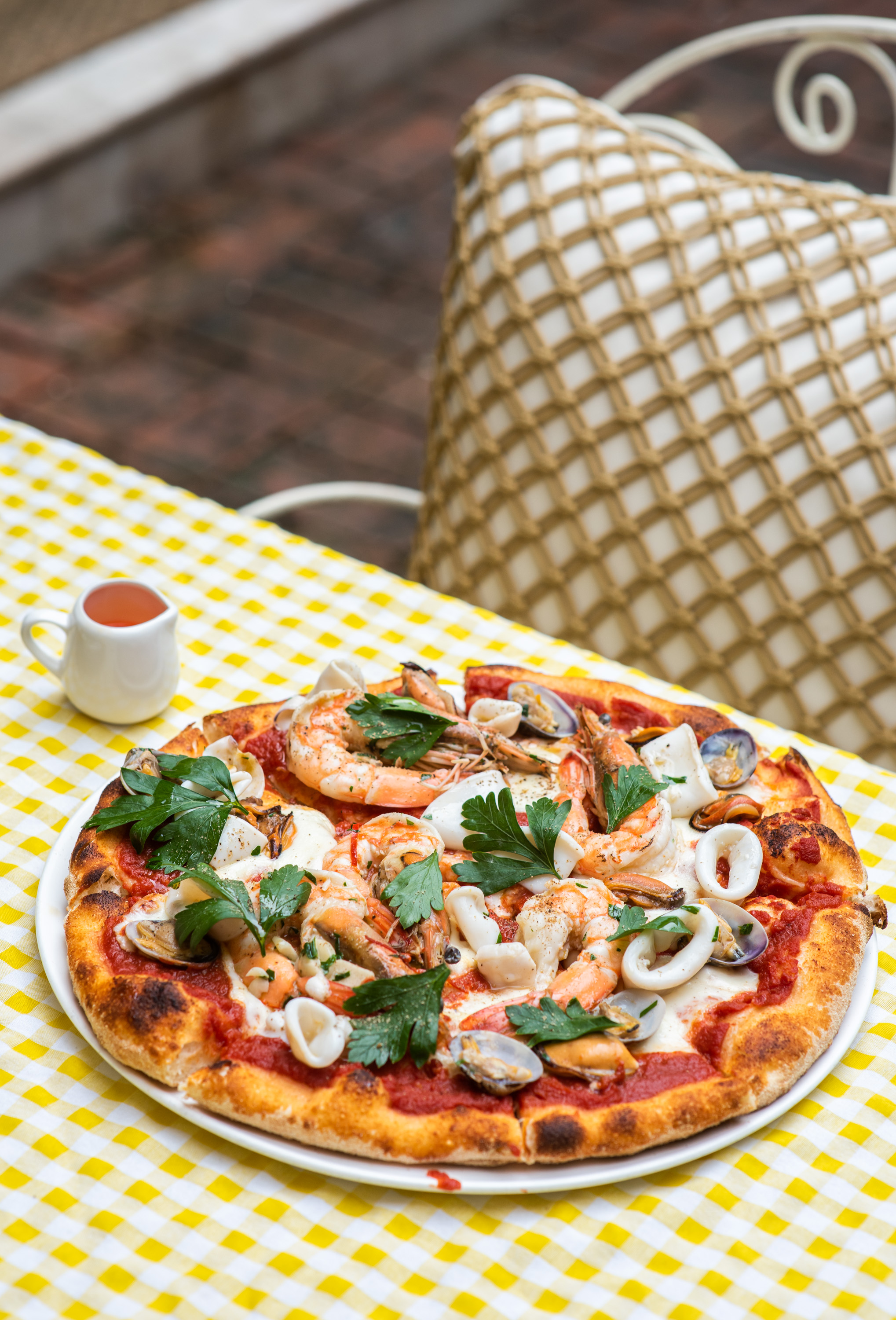 Frutti Di Mare 피자 (650바트): 나폴리 스타일의 피자에는 큼직한 새우, 오징어, 조개 등 풍부한 해산물이 올라가고, 풍성한 토마토 소스로 맛을 더했습니다.