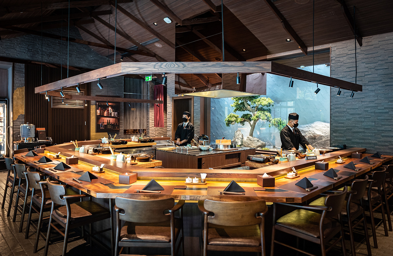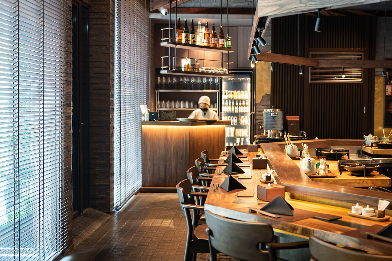 내부는 우드톤의 6각형 바 카운터 중심으로 설계되어 있어, 셰프가 직접 요리하는 모습을 눈앞에서 볼 수 있어요.
