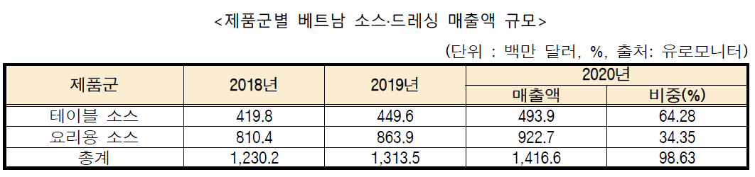 - 2020년 기준 베트남 소스·드레싱 시장 규모는 매출액 기준 약 14억 달러로 추산되며, 19년 대비 7.9% 성장하였음