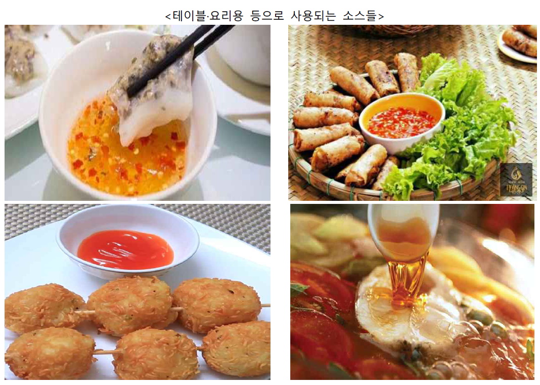 - 베트남 현지의 주로 사용되는 소스는 크게 피시소스와 칠리소스로 구분할 수 있으며, 그 외에 해외 프랜차이즈 식당 증가, 외국산 소스류 수입 확대 및 현지인 입맛 변화 등의 요인에 따라 외국산 소스류(캐찹, 마요네즈, 캡사이신, 핫소스 등)가 베트남 가정 및 식당에서 사용되고 있음