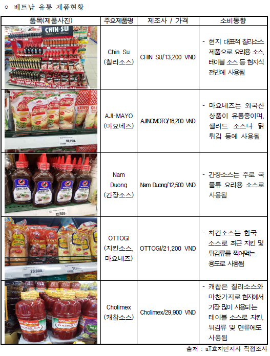 - 중국산, 태국산, 한국산, 일본산 등 다양한 외국산 수입 소스류가 베트남으로 수출되고 있으나 대형유통업체 입점 소스류는 피시소스와 칠리소스를 기반으로 한 베트남산이 대부분이며, 한국산 소스는 한식당 및 일부 프랜차이즈에서 사용되는 것으로 파악됨