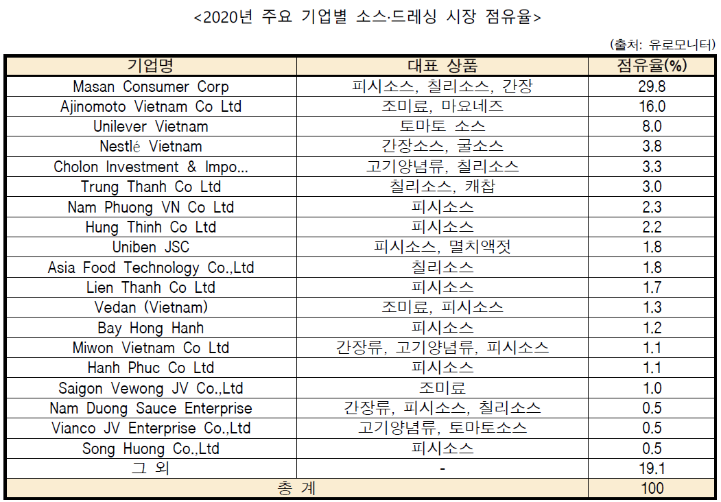 - 베트남내 소스 생산기업으로는 대표적으로 마산 컨슈머가 있으며, 2020년 베트남 소스·드레싱 시장에서 베트남 전체 소스류 시장의 29.8%를 점유하고 있음