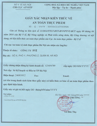 법적 대표자, 요리사 등 식음료 취급 직원: 식품안전지식 확인증 (Certificate on knowledge on food safety)