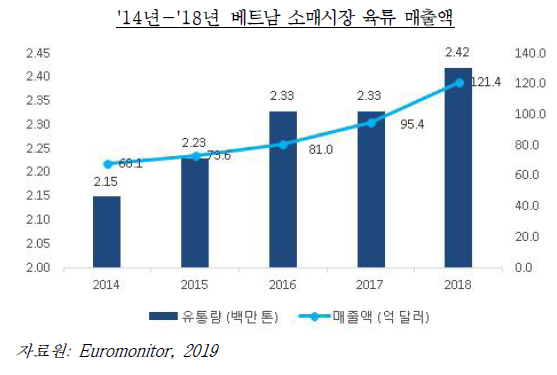 o '18년 소매시장 육류 매출액은 121억 달러이며 소매시장에 240만 톤의 육류가 유통 (VND/USD=23,270) (Euromonitor, 2019)