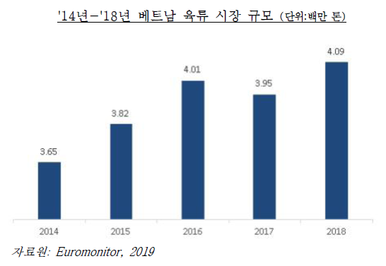 o '18년 베트남 육류 시장 규모는 4백만 톤으로 '14년~'18년 매출액이 연평균 2.9% 성장함(Euromonitor, 2019)