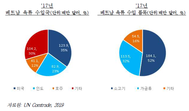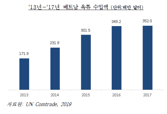 o '17년 베트남은 3억 5천2백만 달러의 육류를 수입했으며 '18년의 공식적인 베트남 육류 수입액 통계는 없음 (UN Comtrade, 2019)