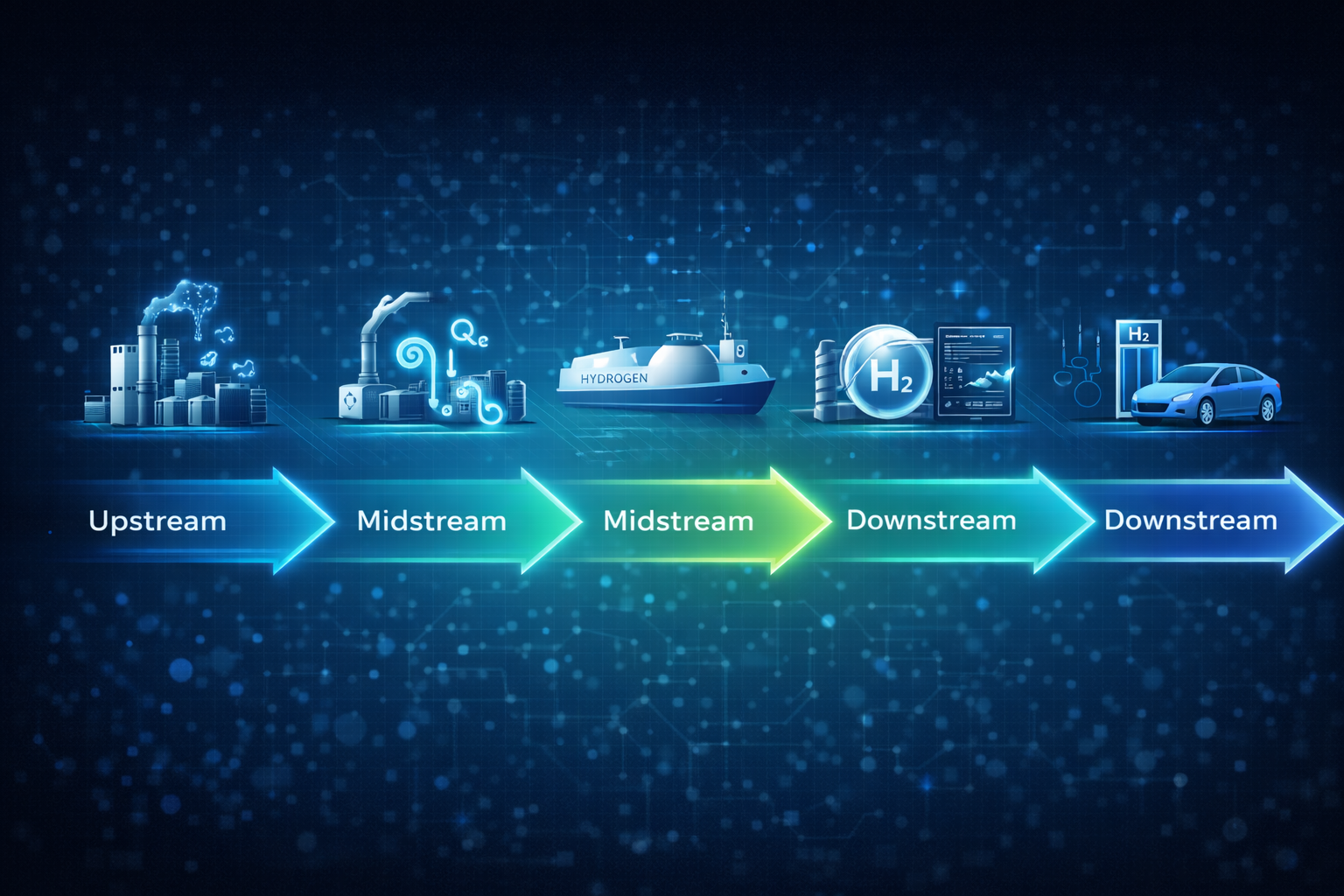 수소는 밸류체인이 긴 산업입니다. 업스트림(생산)만 봐도 수소 자체뿐 아니라 암모니아/LOHC 같은 캐리어 생산, 크래킹 설비 엔지니어링·EPC, 촉매 기술, CCUS까지 다 들어와요. 미드스트림은 트레이딩·운송·저장이고, 다운스트림은 유통·충전·연료전지·모빌리티·산업공정 활용으로 확장됩니다.
