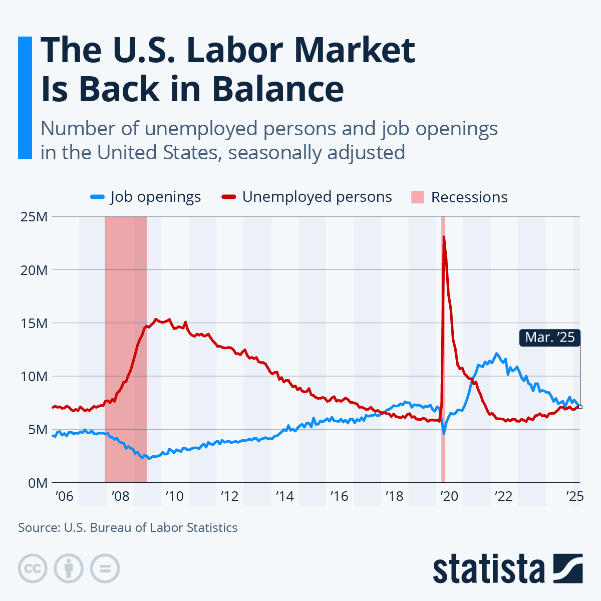 2006년부터 2025년 3월까지 미국의 구인 건수와 실업자 수 변화를 살펴봅니다.