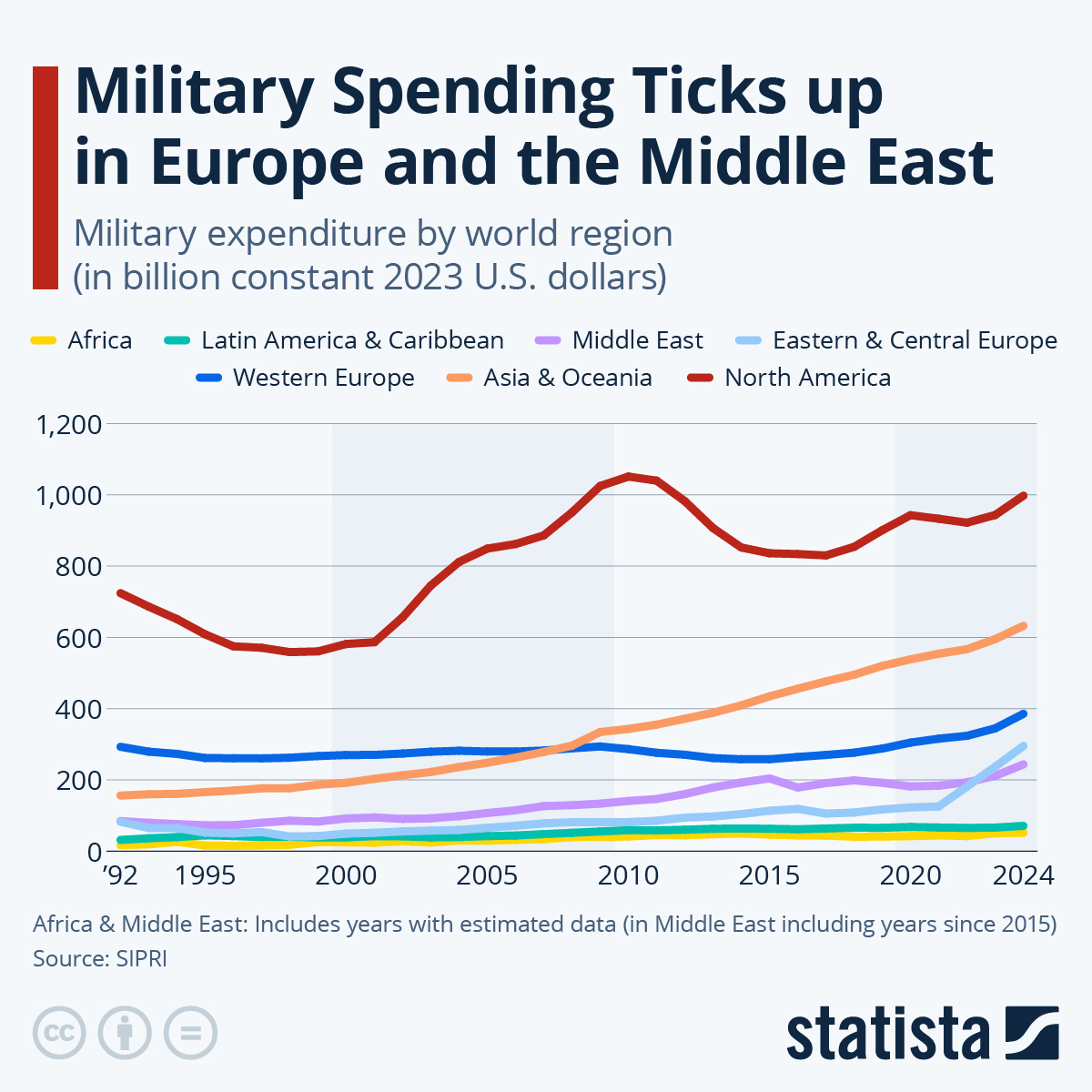 1992년부터 2024년까지 세계 주요 지역별 군사비 지출 변화를 SIPRI 자료로 살펴봤습니다. 북미·아시아·유럽·중동 등 지역별 추이와 안보 환경 변화를 한눈에 확인하세요!