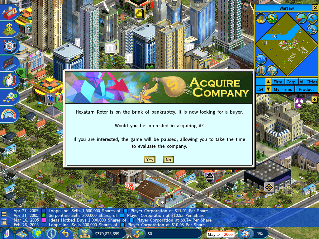 회사가 파산으로 치닫고 있을 때, 당신이 그것을 취득하는 것에 관심이 있는지 묻는 다음 창이 나타날 것이다.
