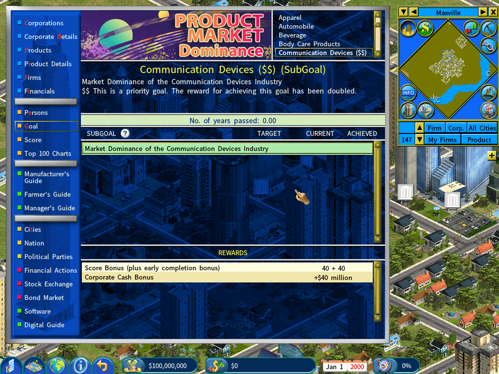 If you choose this goal set, which comprises goals for achieving market dominance of every product class, the goal system will randomly choose a product class and set it as a priority goal, offering a greater incentive for achieving it (the award for achieving it is doubled).