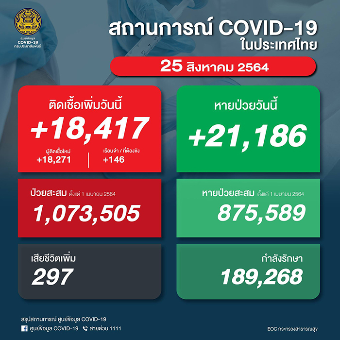 8월 25일(수) 아침 태국 보건부의 코로나-19 최신 감염 상황을 발표에 따르면, 국내에서 확인된 신규 감염자는 18,417명으로 전날의 17,165명 보다 증가했다. 사망자 수도 297명으로 전날의 226명 보다 증가했다. 또한 건강이 회복되어 퇴원한 사람은 21,186명으로 신규 감염자 보다 많았다.