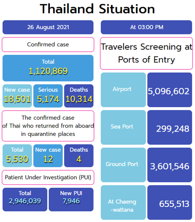 8월 26일 오후 12시 30분 태국 코로나-19 상황 관리 센터(CCSA)는 태국 국내에서 확인된 신규 코로나-19(COVID-19) 감염자는 전날보다 증가한 18,501명이라고 발표했다. 코로나-19 누적 감염자는 총 1,120,869명이 되었다. 사망자는 229명 늘어 총 10,314명이 되었다. 또한 병세가 회복되어 퇴원한 사람은 20,606명으로 신규 감염자 보다 많았다.