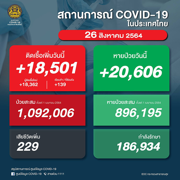 8월 26일(목) 아침 태국 보건부의 코로나-19 최신 감염 상황 발표에 따르면, 국내에서 확인된 신규 감염자는 18,501명으로 전날의 18,417명 보다 증가했다. 사망자 수는 229명으로 전날의 297명 보다 감소했다. 또한 건강이 회복되어 퇴원한 사람은 20,606명으로 신규 감염자 보다 많았다.