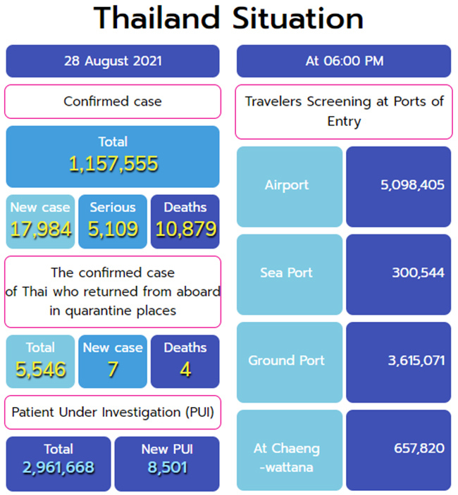 8월 28일 오후 12시 30분 태국 코로나-19 상황 관리 센터(CCSA)는 태국 국내에서 확인된 신규 코로나-19(COVID-19) 감염자는 전날보다 감소한 17,984명이라고 발표했다. 코로나-19 누적 감염자는 총 1,128,692명이 되었다. 사망자는 292명 늘어 총 10,879명이 되었다. 회복되어 퇴원한 사람은 20,505명으로 신규 감염자 보다 많다.