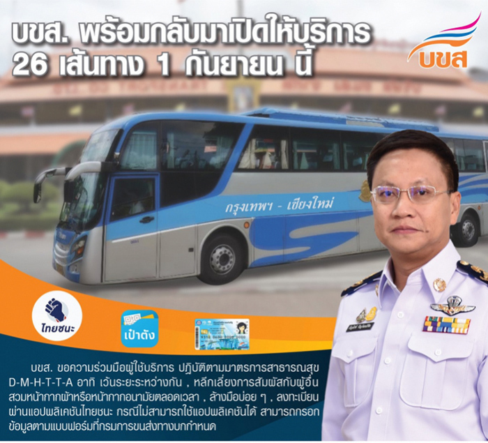 장거리 버스를 운영하고 있는 ‘콘쏭(บขส)’은 정부가 발표한 코로나-19 규제 완화 발표에 따라 9월 1일부터 26개 노선의 운행 재개한다고 발표했다. 승객 수는 정원의 75% 이하로 제한된다.