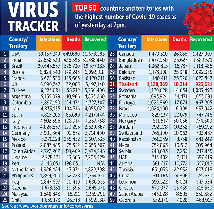 지금까지 태국 국내에서 확인된 감염자는 1,157,555명이며, 그중 20,535명이 완치되어 퇴원했고, 182,357명이 치료 중이고, 10,879명이 사망했다.