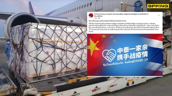 태국 주재 중화인민공화국 대사관(Chinese Embassy Bangkok) 공식 페이스북에는 “중국 정부와 인민이 태국 국민들에 대한 선의와 우정을 보여주기 위해 코로나-19와 싸우고 있는 태국을 전폭적으로 지원할 예정이다. 중국 정부는 비상사태 상황에서 코로나-19와 싸울 수 있도록 손가락 맥박 산소 측정기와 산소 발생기 등 1,000만 위안에 달하는 의료용품을 기부할 예정이다. 전염병은 냉혹할 수 있지만 우리는 인간적인 친구로서 서로 사랑한다. 중국과 태국은 고통을 함께 나누고 위기를 함께 극복해 나갈 것이다(เพื่อเป็นการแสดงไมตรีจิตและมิตรภาพที่รัฐบาลและประชาชนจีนมีต่อให้รัฐบาลและประชาชนไทย สนับสนุนประเทศไทยในต่อสู้กับโควิด-19อย่างเต็มที่ รัฐบาลจีนจะบริจาคเวชภัณฑ์ในการต่อสู้กับโควิด-19ในภาวะฉุกเฉินให้รัฐบาลไทยเป็นมูลค่าทั้งหมด 10 ล้านหยวน ซึ่งประกอบด้วยเครื่องวัดออกซิเจนที่ปลายนิ้วและเครื่องผลิตออกซิเจน ฯลฯ โรคระบาดอาจไร้ความปรานี แต่เพื่อนมนุษย์เรามีความรักต่อกัน จีนกับไทยจะร่วมทุกข์ร่วมสุขและฟันฝ่าวิกฤตด้วยกัน)”는 글을 올렸다.
