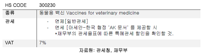 백신: HS Code 300230 는 동물용 백신. 한국은 태국의 수입원이며 총 동물백신 수입원 중 7위를 차지. 백신 수입액 및 수입량은 2012년 이후로 증가하고 있으며, 태국 바이어들 사이에서 신뢰를 얻고 있음.