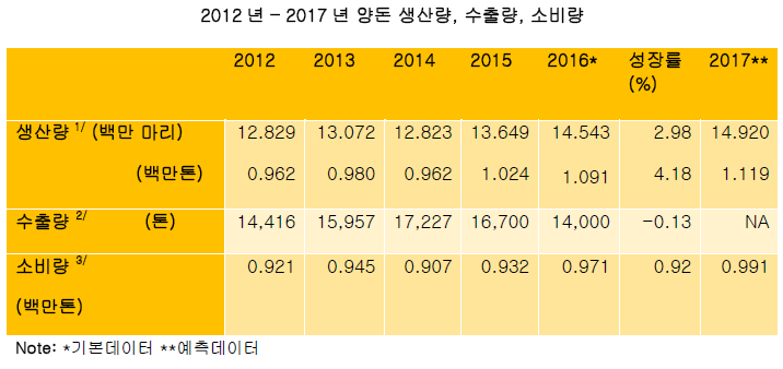 2017년 양돈 생산은 국내 소비량 증가로 인해2016년 대비 2.59% 증가하여1,492만 마리로 예상. 이웃국가들의 양돈 소비량 또한 늘어날 것으로 기대. 러시아의 경제가 성장함에 따라, 러시아로의 수출이 증가될 것으로 예상.