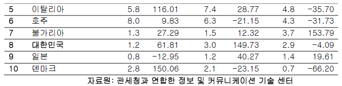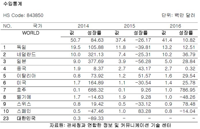 한국은 10개 수입국 중 7위를 기록하고 있으며, 2016년 290만 달러를 기록하며 2015년 대비 5.75% 상승 (280만 달러)
