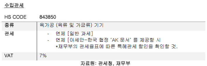 태국은 많은 양계장을 보유한 국가. 육류 및 가금류 가공을 위해서, 적절한 기기가 필요함. 이러한 기기의 총 수입액은 2016년 4,140만 달러에 달하며 2015년 대비 10.82% 성장.
