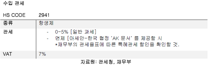 항생제: 관세청의 사무관인 Piyanit씨에 따르면, HS Code 2941 제품은 사람과 동물 모두에게 사용되는 항생제를 포함. HS Code 2941 제품에는 페니실린, 아목시실린, 스트렙토마이신, 테트라사이클린, 클로람페니콜, 에리트로마이신이 포함됨.