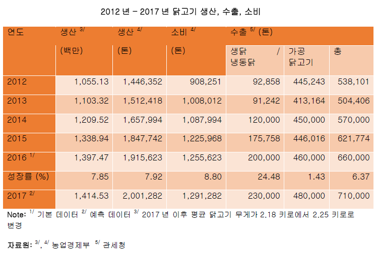 영계 및 닭고기의 생산은 국내 및 국제 시장의 수요가 증가함에 따라 늘어날 것으로 전망. 2017년에는 14억 1,453만 영계가 생산된 것으로 추정되며 2016년과 비교하여 1.22% 증가할 것으로 보임.