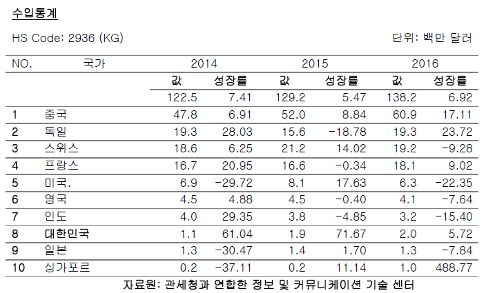 비타민: 관세청 사무관 Piyanit 씨에 따르면, HS Code 2936 제품은 사람 및 동물에게 모두 사용되는 비타민을 포함. 한국은 총 수입국가들 중 8위를 차지.