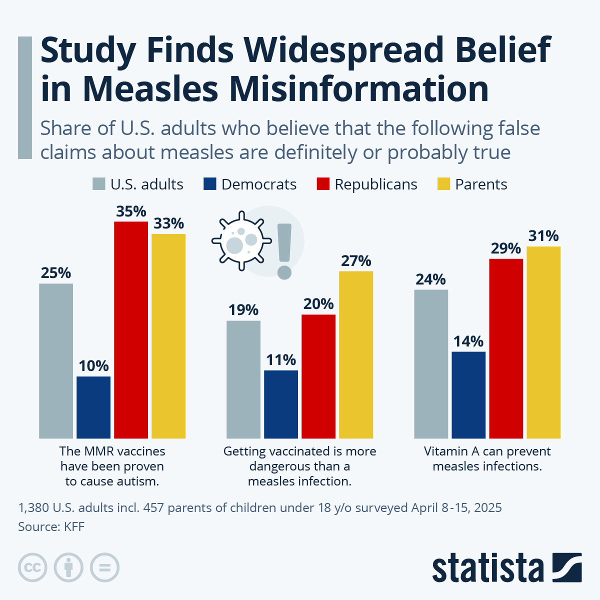 2025년 4월 KFF 설문(457명 대상)과 최신 보건 통계를 종합하면, 미국 성인의 25%가 “MMR 백신이 자폐를 유발한다”는 허위주장을, 19%가 “백신 접종이 홍역 감염보다 위험하다”고, 24%는 “비타민 A로 홍역을 막을 수 있다”고 믿고 있습니다. 이러한 허위정보는 실제 접종 기피로 이어져, 2025년 현재 확인된 홍역 환자가 884명(29개주)에 달하며, 이 중 97%가 백신 미접종자 또는 미확인자입니다 ABC News.
