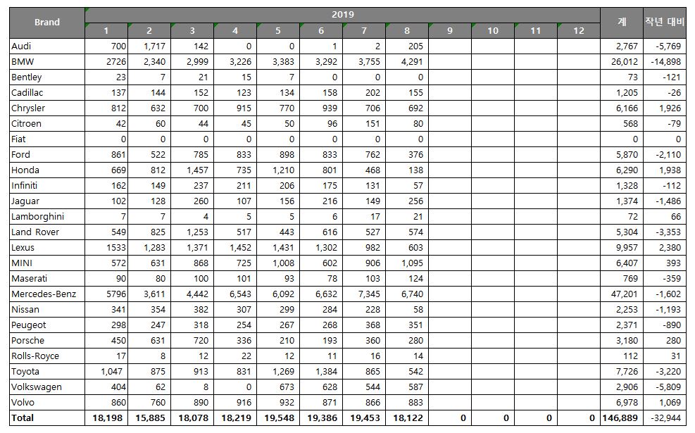 2019년 1월~8월 한국 내수 시장에서의 월별 수입 자동차 판매량 1위는 총 47,201대를 판매한 Mercedes-Benz 2위는 BMW로 총 26,012대의 판매량을 기록 Lexus, Toyota, Volvo 순